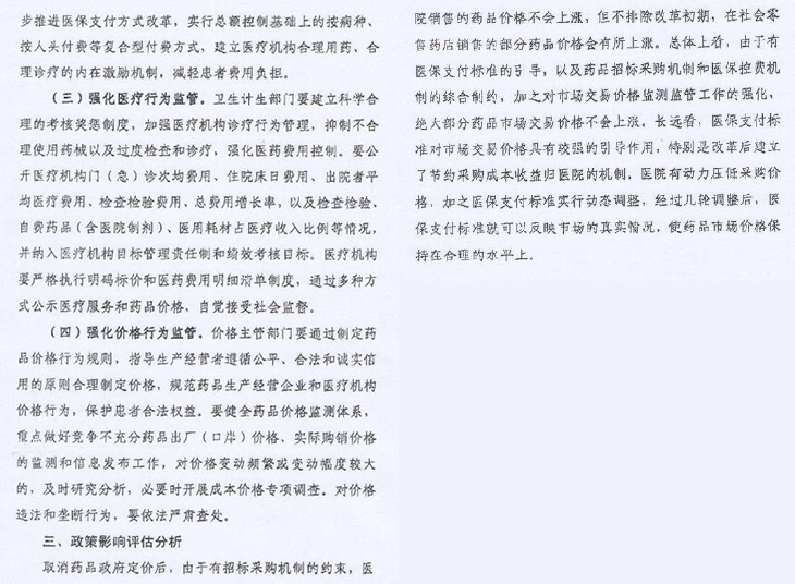 取消藥品政府定價(jià)后,由于有招標(biāo)采購(gòu)機(jī)制約束,醫(yī)院銷(xiāo)售藥品價(jià)格不會(huì)上漲。但不排除改革初期,零售藥店銷(xiāo)售部分藥品價(jià)格會(huì)有所上漲。總體來(lái)看,由于有醫(yī)保支付標(biāo)準(zhǔn)引導(dǎo),以及招標(biāo)采購(gòu)機(jī)制和醫(yī)??刭M(fèi)機(jī)制綜合制約(價(jià)格放開(kāi)后未來(lái)主要價(jià)格管理應(yīng)由衛(wèi)計(jì)委和醫(yī)保部門(mén)負(fù)責(zé)),加之對(duì)市場(chǎng)交易價(jià)格監(jiān)測(cè)監(jiān)管強(qiáng)化(物價(jià)部門(mén)主要職責(zé)是加強(qiáng)市場(chǎng)監(jiān)管)。絕大部分藥品市場(chǎng)交易價(jià)格不會(huì)上漲。長(zhǎng)遠(yuǎn)看醫(yī)保支付標(biāo)準(zhǔn)對(duì)市場(chǎng)交易價(jià)格有較強(qiáng)引導(dǎo)作用。特別是建立節(jié)約采購(gòu)成本收益歸醫(yī)院機(jī)制,醫(yī)院有動(dòng)力壓低藥價(jià),加之醫(yī)保支付標(biāo)準(zhǔn)實(shí)時(shí)動(dòng)態(tài)調(diào)整,經(jīng)過(guò)幾輪(壓價(jià))調(diào)整后,醫(yī)保支付標(biāo)準(zhǔn)就可以反映市場(chǎng)真實(shí)情況。使藥品市場(chǎng)價(jià)格保持在合理水平上。