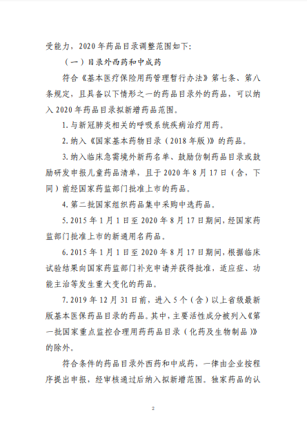 2020年8月3日-10日,國(guó)家醫(yī)療保障局就《2020年國(guó)家醫(yī)保藥品目錄調(diào)整工作方案(征求意見(jiàn)稿)》向社會(huì)公開(kāi)征求了意見(jiàn)。8月17日,《2020年國(guó)家醫(yī)保藥品目錄調(diào)整工作方案》和《2020年國(guó)家醫(yī)保藥品目錄調(diào)整申報(bào)指南》正式公布。