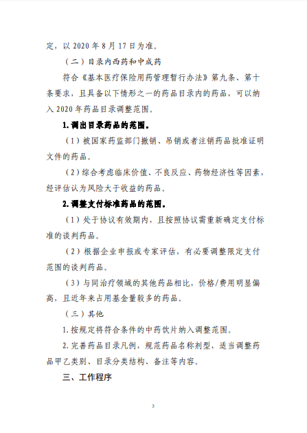 2020年8月3日-10日,國家醫(yī)療保障局就《2020年國家醫(yī)保藥品目錄調(diào)整工作方案(征求意見稿)》向社會公開征求了意見。8月17日,《2020年國家醫(yī)保藥品目錄調(diào)整工作方案》和《2020年國家醫(yī)保藥品目錄調(diào)整申報指南》正式公布。